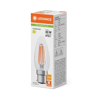 Ledvance Classic LED B22 Candle Filament Clear 3.4W 470lm - 827 Extra Warm White | Replaces 40W